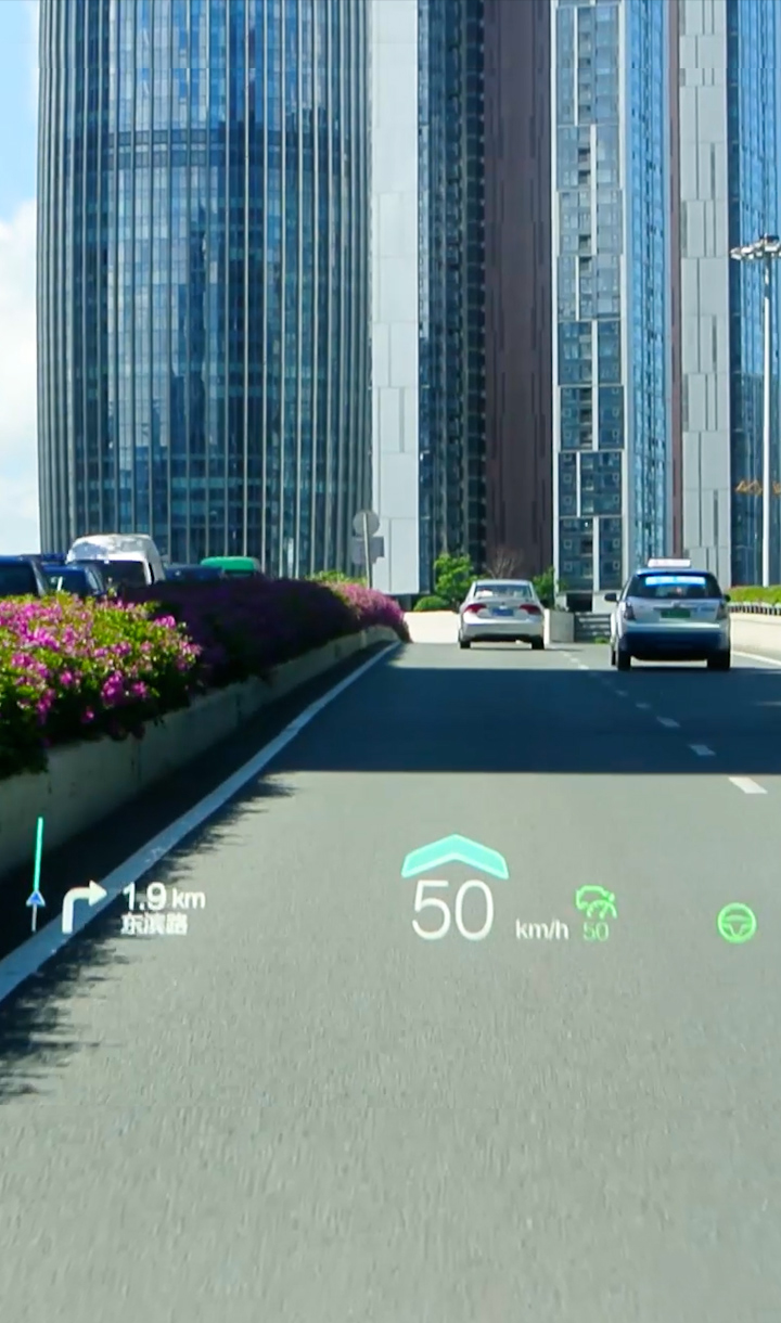 基于復(fù)雜變量環(huán)境完成大尺寸、小體積的光機(jī)設(shè)計,并采用多數(shù)據(jù)融合算法實現(xiàn)導(dǎo)航、ADAS等輔助駕駛信息在真實路況上的疊加、融合顯示,提升駕駛安全性的同時給予更酷炫、更智能的駕駛體驗。